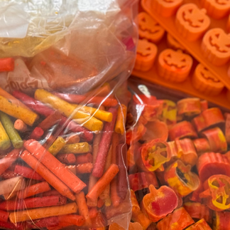 We wanted to include a game in the kits but it needed to be one that the KindCraft kids could put together. So we came up with Halloween Tic Tac Toe-a simple game someone could easily play while staying at the RMCH-that is of course, as long as they don't eat the game pieces! Each bag was filled with five candy pumpkins and five candy corns. It was neat to here the different reactions to the smell of all that candy!